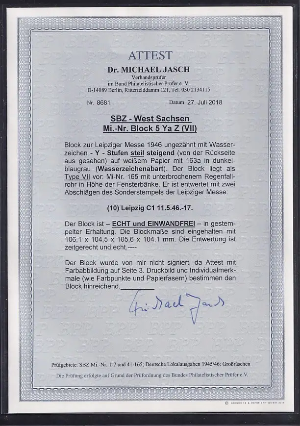 SBZ, West Sachsen., Mi.-Nr. Block 5 Ya Z, gestempelt, FA. Dr. JaschBPP.