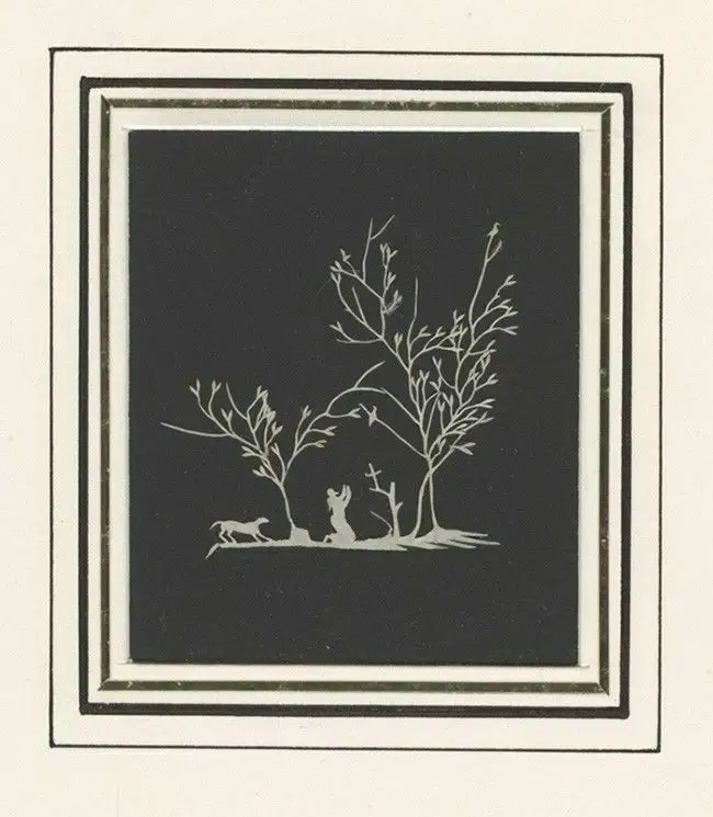 Bemerkungen: Überaus filigraner Scherenschnitt. Zu sehen ist ein kniender, betender Mönch mit Bart zwischen 2 Bäumen.