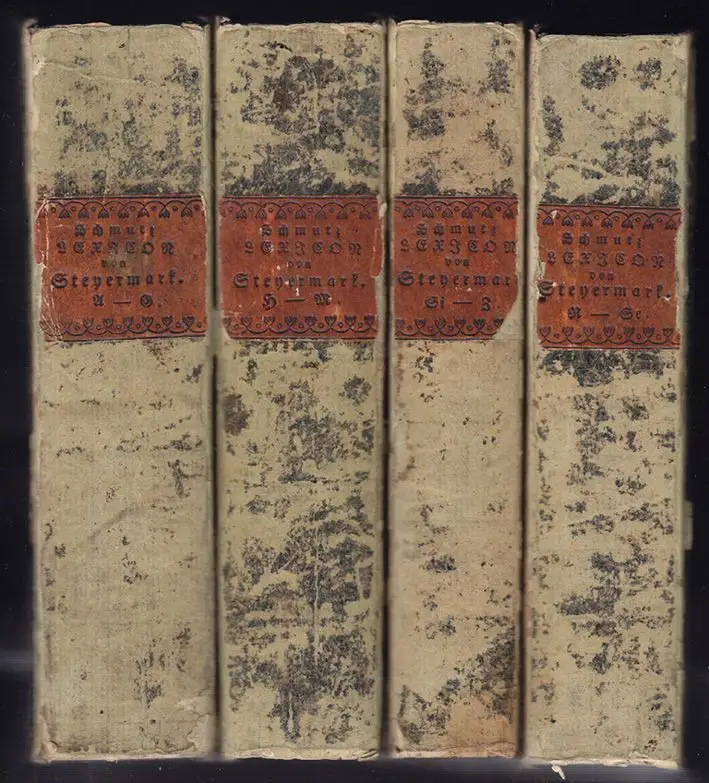 Bemerkungen: Wurzbach XXX, 342; Schlossar 987; Zischka 101; Engelmann 864 - "Mit seinem Lexikon, das auch biographische und genealogische Angaben enthält, schuf Schmutz eine umfassende Landesaufnahme, die auch heute noch einen nützlichen Behelf für die landesgeschichtliche Forschung der Steiermark darstellt, u.a. durch den Abdruck inzwischen verlorengegangener Quellen" (ÖBL X, 348). "Wenig gekanntes und seltenes Werk" (Wurzbach).