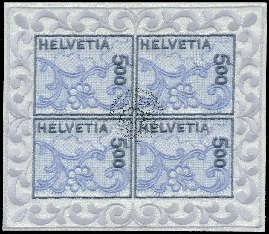 5 Fr Stickereimarke im Kleinbogen zu 4 Stück, mit ESST