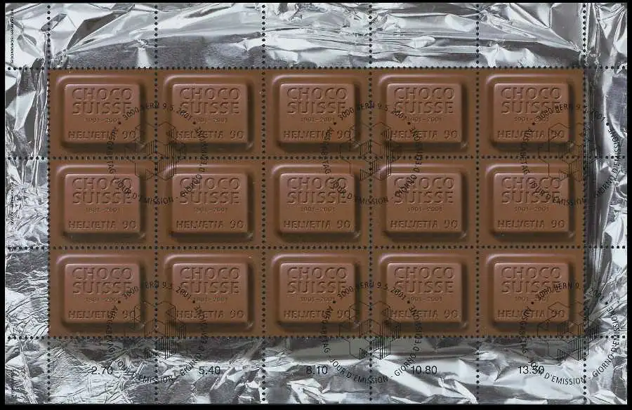 90 C Wert aus der Ausgabe Schweizer Schokolade im Kleinbogen zu 15 Stück mit ESST