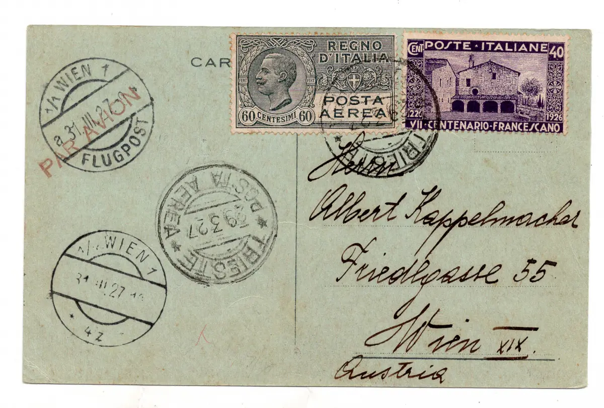 - S.I.S.A. Werbekarte der neuen Handelslinie Turin - Triest am 29.3.27 mit P.O. Nr. 194 + P.A. Cent. 60 Nr. 3 - Uncommon Nr.309/19