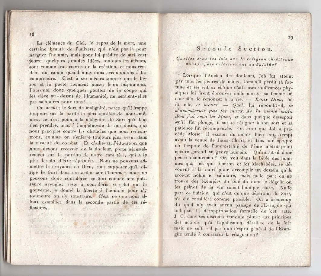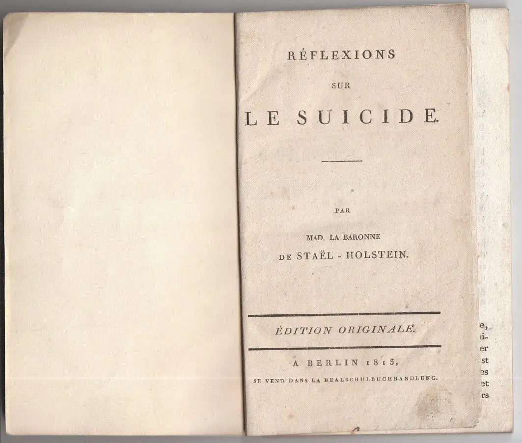 Bemerkungen: Seltener deutscher Druck im Jahr der Erstausgabe in London bei Longman & Co. - Anne Louise Germaine Necker wird am 22. April 1766 in Paris als Tochter des Schweizer Bankiers und späteren Finanzministers Ludwig XVI, Jacques Necker, geboren. Sie genießt eine gute protestantische Erziehung. Politisch und philosophisch interessiert, eilt sie dem Vorbild ihrer Mutter nach und eröffnet 20-jährig ihren eigenen Salon in Paris. 1786 heiratet sie den Baron Stael-Holstein. Ihre Familie flieht 1792 erstmals aus Frankreich, eine Reihe von Napoleon erzwungenen Auslandsaufenthalten folgen. 1803 macht sie in Deutschland Bekanntschaft mit Goethe, Schiller, Wieland und Schlegel. Im Zuge der Restoration läßt sie sich erneut in Frankreich nieder und stirbt 1817 in Paris.