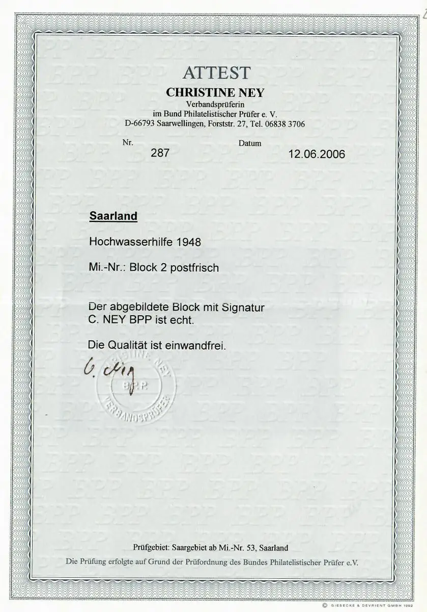 Saar: MiNr. Block 2, postfrisch, **, BPP Attest