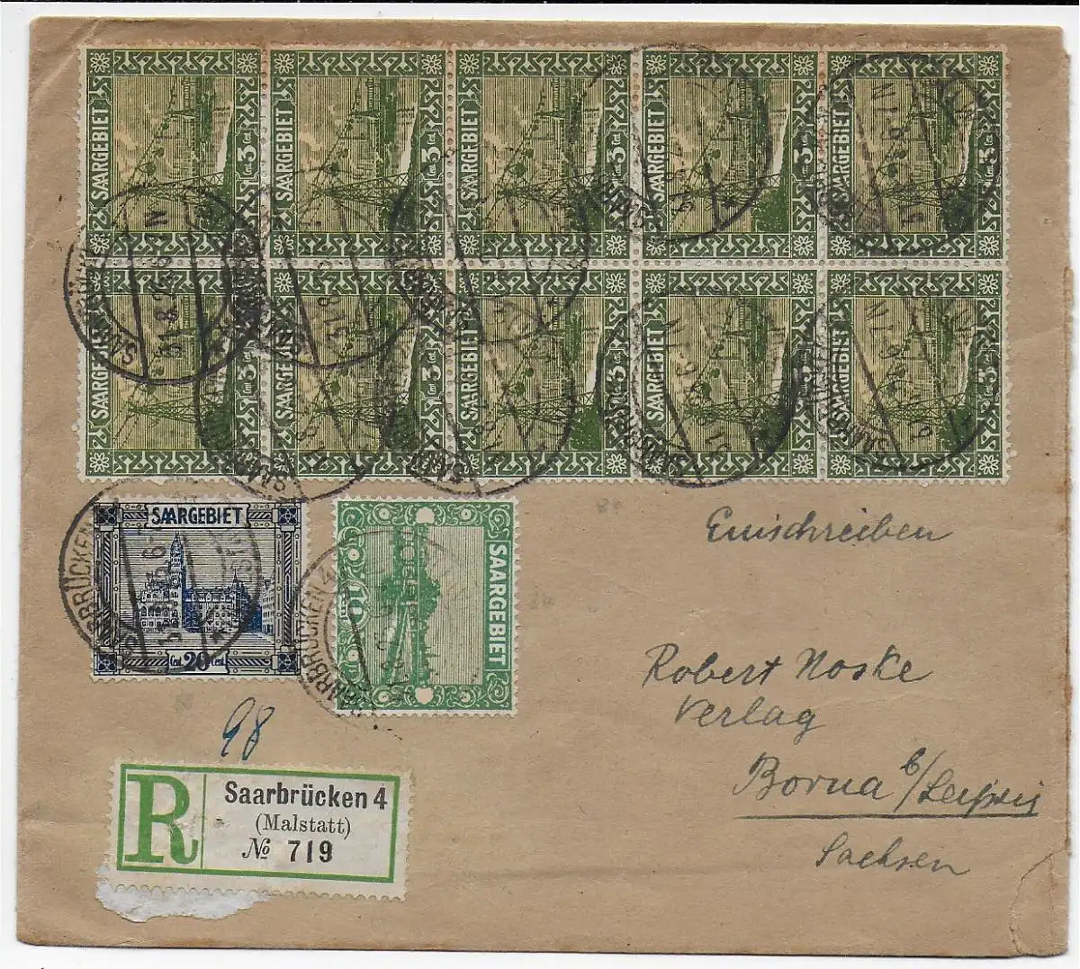 Saargebiet 1922: Einschreiben Saarbrücken nach Borna