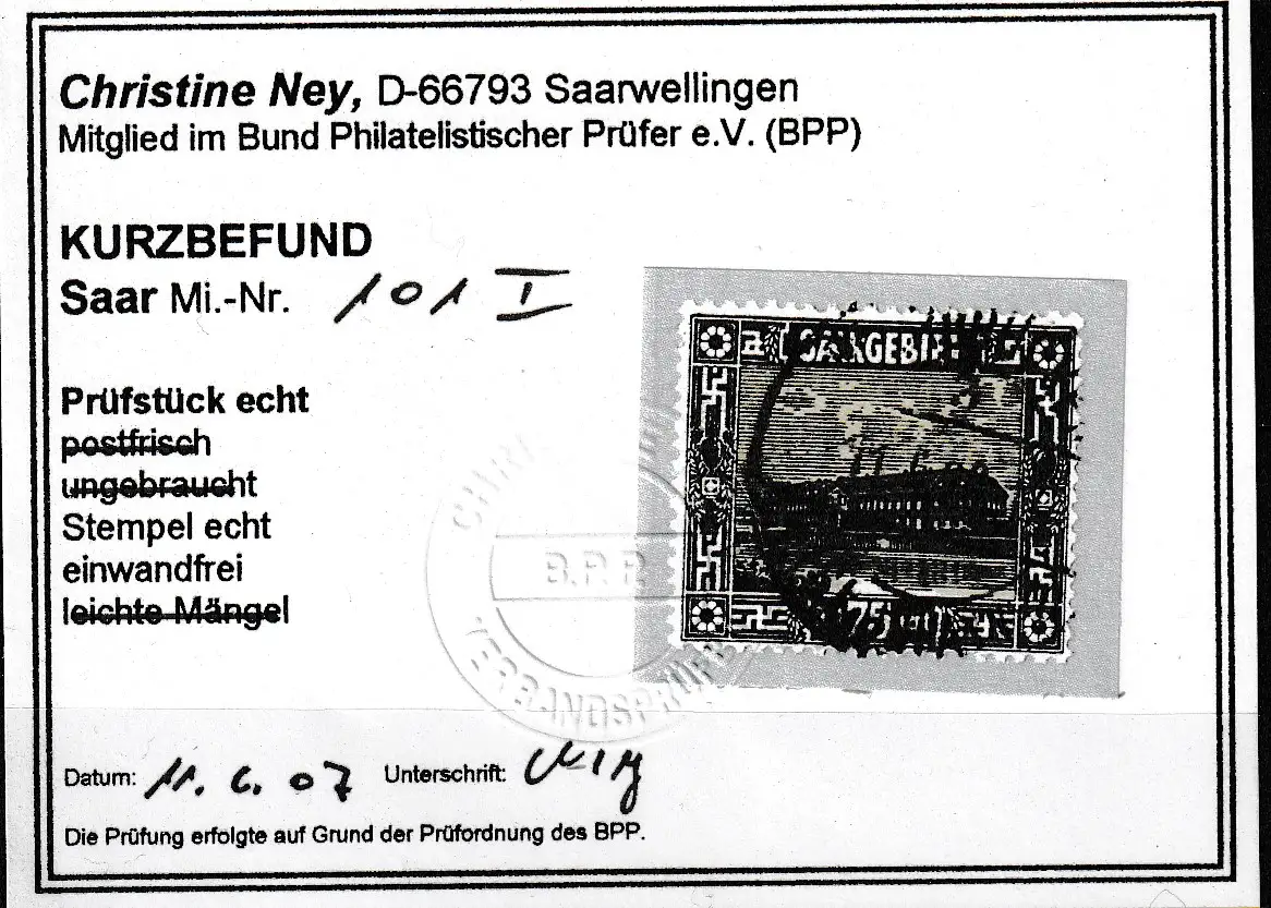 Saargebiet, Mi.-Nr. 101 mit PF I, gest., Kurzbefund Ney BPP