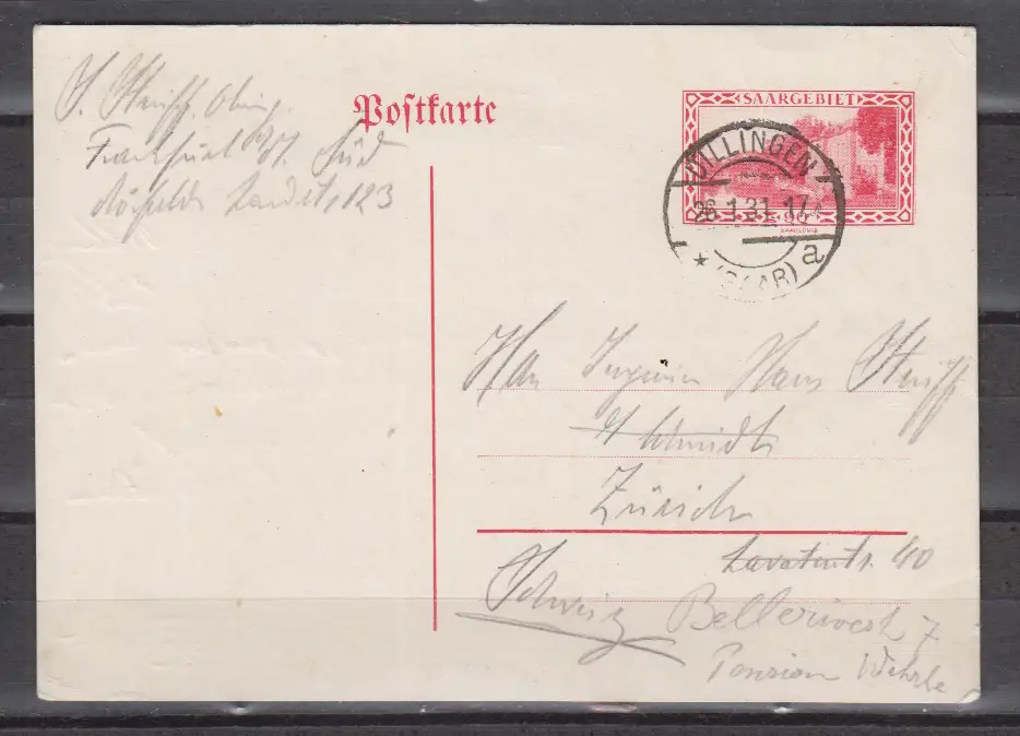 Saargebiet Auslands-GZS MiNo. P 21 o Dillingen 1931 in die Schweiz