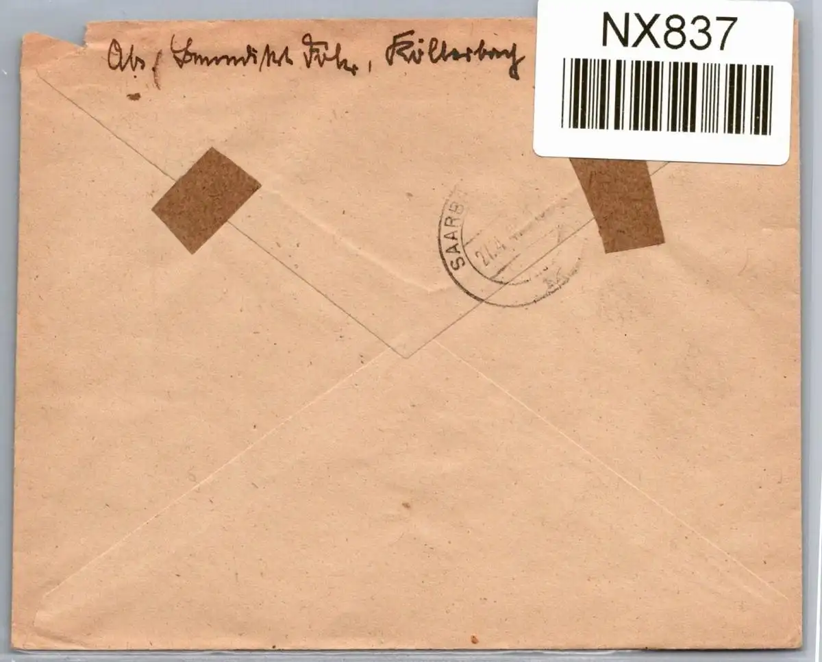 20 Franc als Einzelfrankatur auf Fernbrief Einschreiben portogerecht am 25.4.1948 von Köllerbach nach Saarbrücken gelaufen.