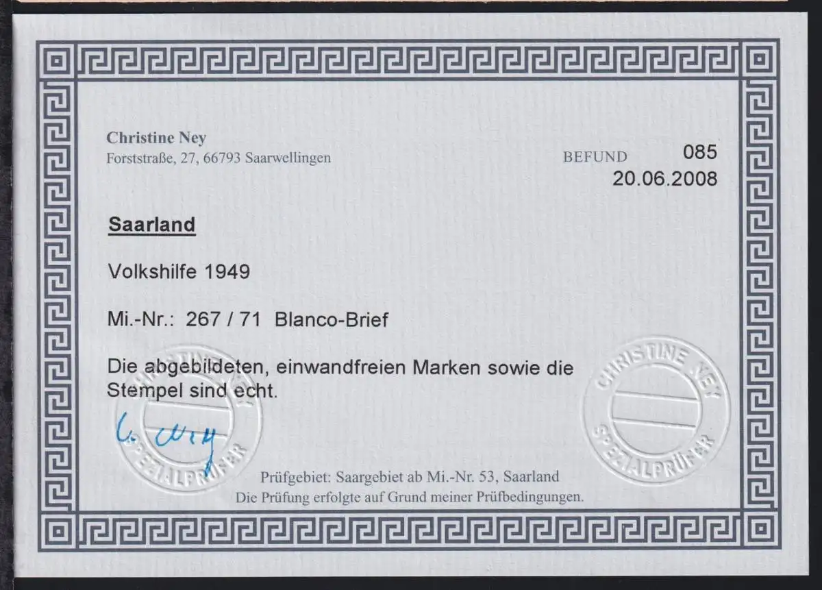 Saarland 267-271 auf Brief Blanco-Brief, Befund Ney #OC730