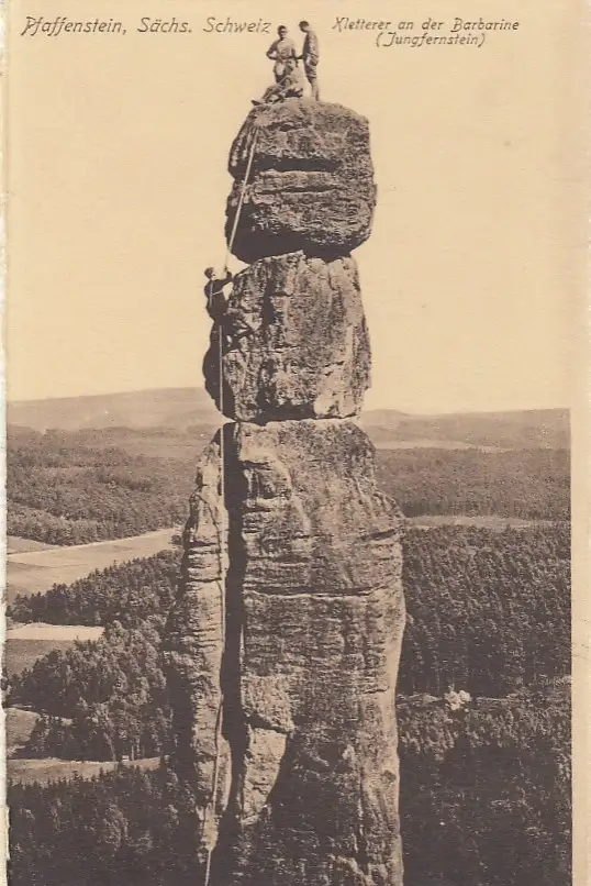 Sächs.Schweiz, Pfaffenstein, Kletterer a.d. Barbarine (Jungfernstein) ngl E6979