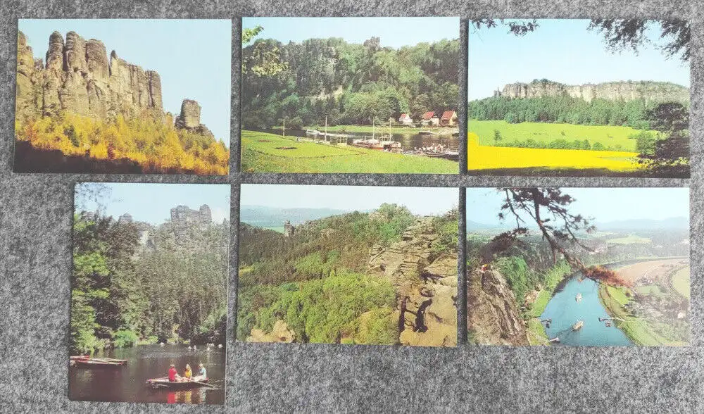 Originale Bildermappe "Sächsische Schweiz". Mappe: 9,8 x 7,2 cm, Inhalt: 6 Bilder. Erhaltung: Verpackung hat altersgerechte Gebrauchsspuren, alles weitere siehe bitte Fotos.