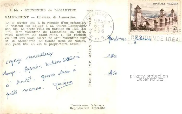 Saint-Point Château de Lamartine Schloss Saint-Point postalisch gelaufen 1956 Erhaltung siehe scans [FriedD77] Frierer