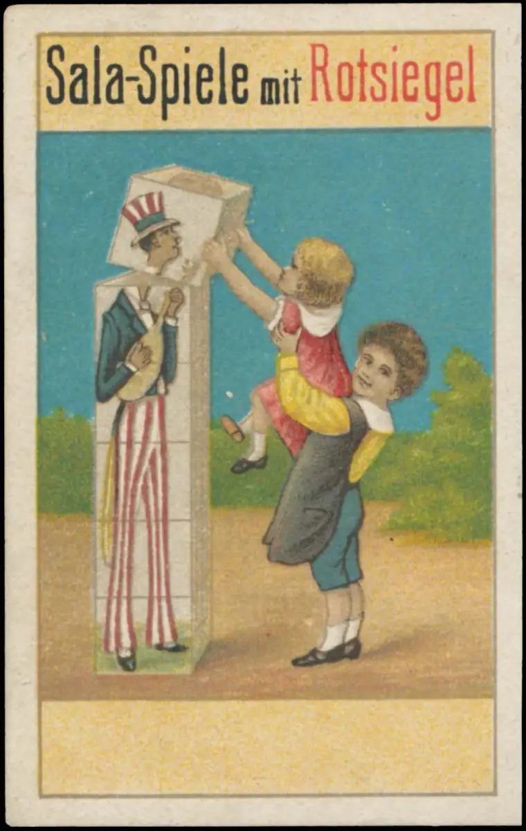 Kinder, Spielzeug, Verlag der Sala-Spiele mit Rotsiegel, Größe/Zustand: 6x4 , guter Zustand, Original alte Reklamemarke die seinerzeit für die Werbung benutzt wurde
