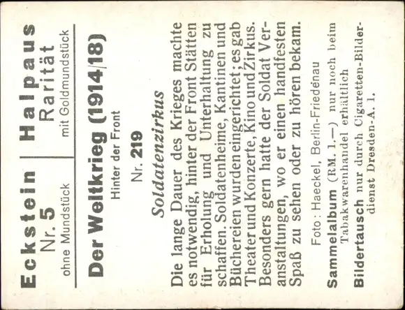 Sammelbild Der Weltkrieg 1914/18, Hinter der Front Nr. 219, Soldatenzirkus
