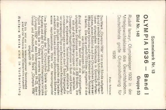 Sammelbild Olympia 1936, Gewichtheber Rudolf Ismayr
