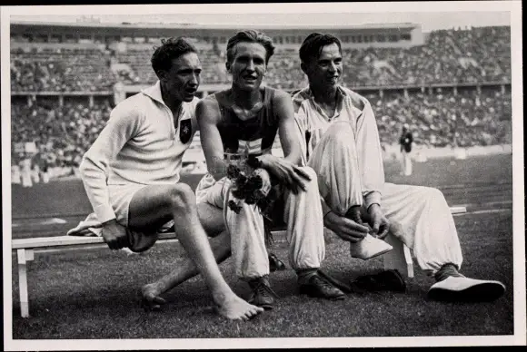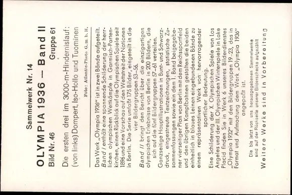 Sammelbild Olympia 1936, Hindernisläufer Dompert, Iso Hollo, Tuominen