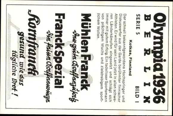 Sammelbild Olympia 1936, Kotkas, Hochspringer, Mühlen Franck Kaffeezusatz
