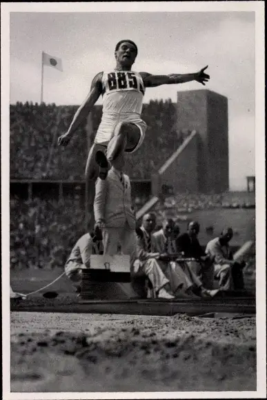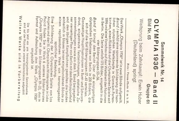 Sammelbild Olympia 1936, Zehnkämpfer Erwin Huber beim Weitsprung