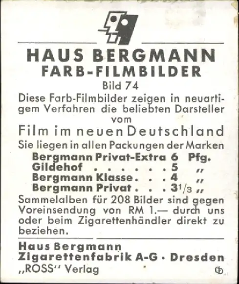 Zustand, siehe Scan, ungelaufen- Haus Bergmann, Farb-Filmbilder, Zigarettenfabrik AG Dresden - ca 5 cm X 6 cm