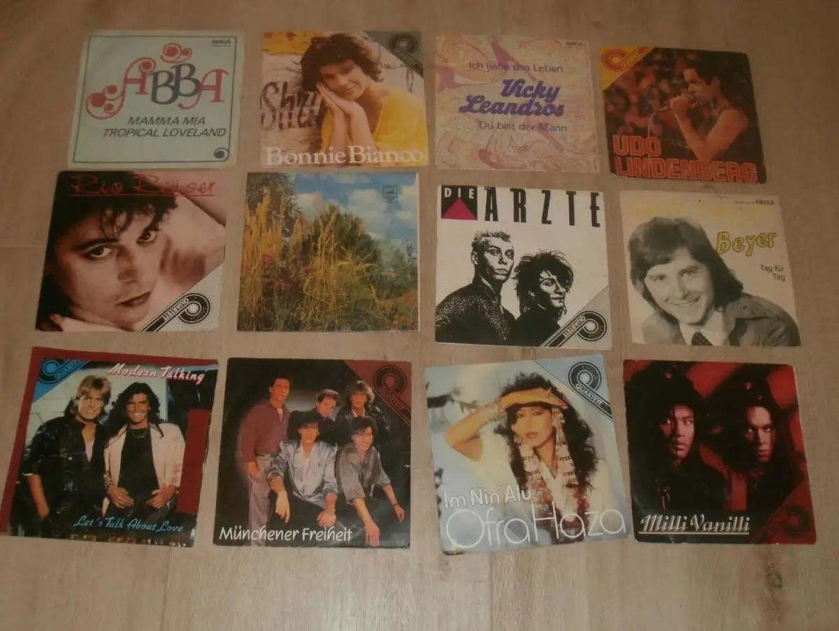 Sammlung von 12 Amiga Schallplatten , DDR , Vinyl , Udo Lindenberg , Rio Reiser , Abba , Modern Talking Bonnie Bianco , Vicky Leandros , Die Ärzte , Ofra Haza , Milli Vanilli , Hans Jürgen Beyer , hinten mit Staraufklebern verschiedener Richtungen