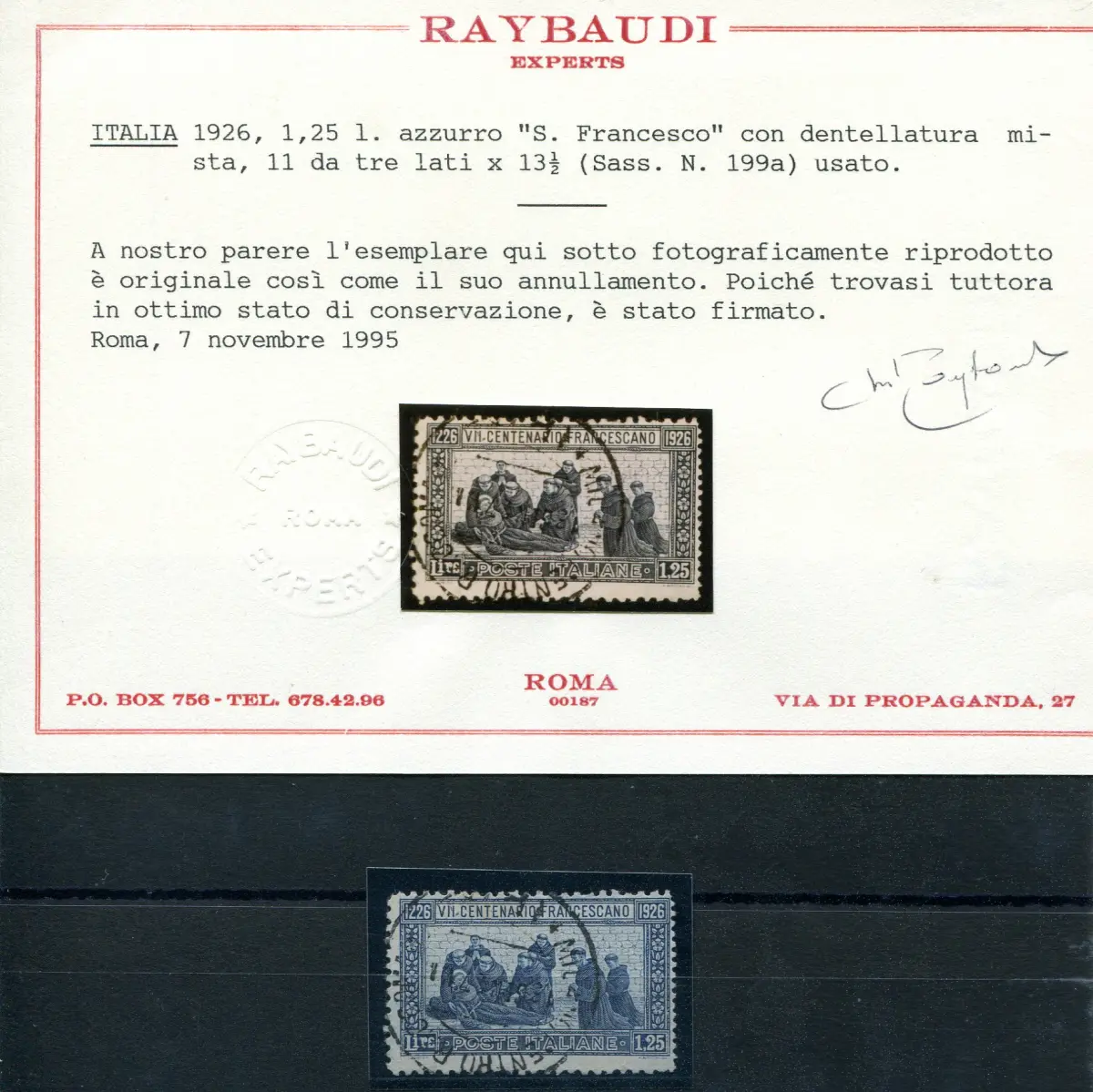 San Francesco Lire 1,25 Sorte gezackt 11 dreiseitig Gebraucht - San Francesco Lire 1,25 Nr. 199a dreiseitig 11 gezahnt und 13,1/2 rechts gezahnt - Selten, Sorte nicht zitiert - Cert. Ray. Cod. 144/13