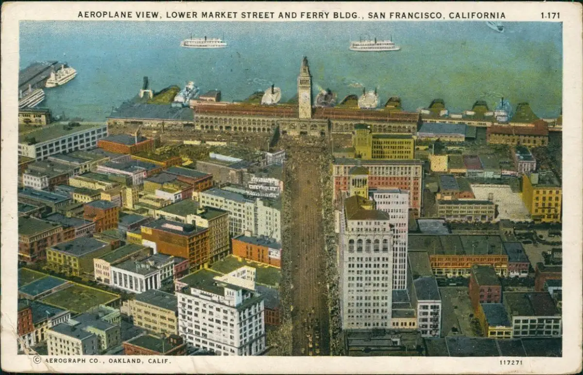 San Francisco AEROPLANE VIEW, LOWER MARKET STREET AND FERRY BLDG. 1933