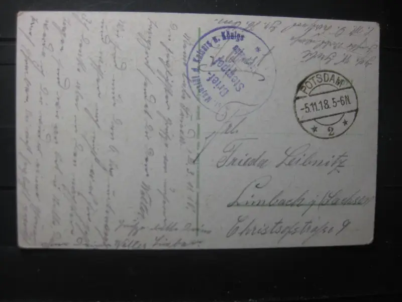 ca. 1918; Unschärfen, Spiegelungen, Verbiegungen sind allein durch das abfotografieren bedingt; Karte ist beidseitig abgebildet, Erhalt siehe Scan; ist das Foto qualitativ nicht aussagekräftig genug, kann es besseres Foto angefordert werden. Rückgabe bei Karten ist generell ausgeschlossen.