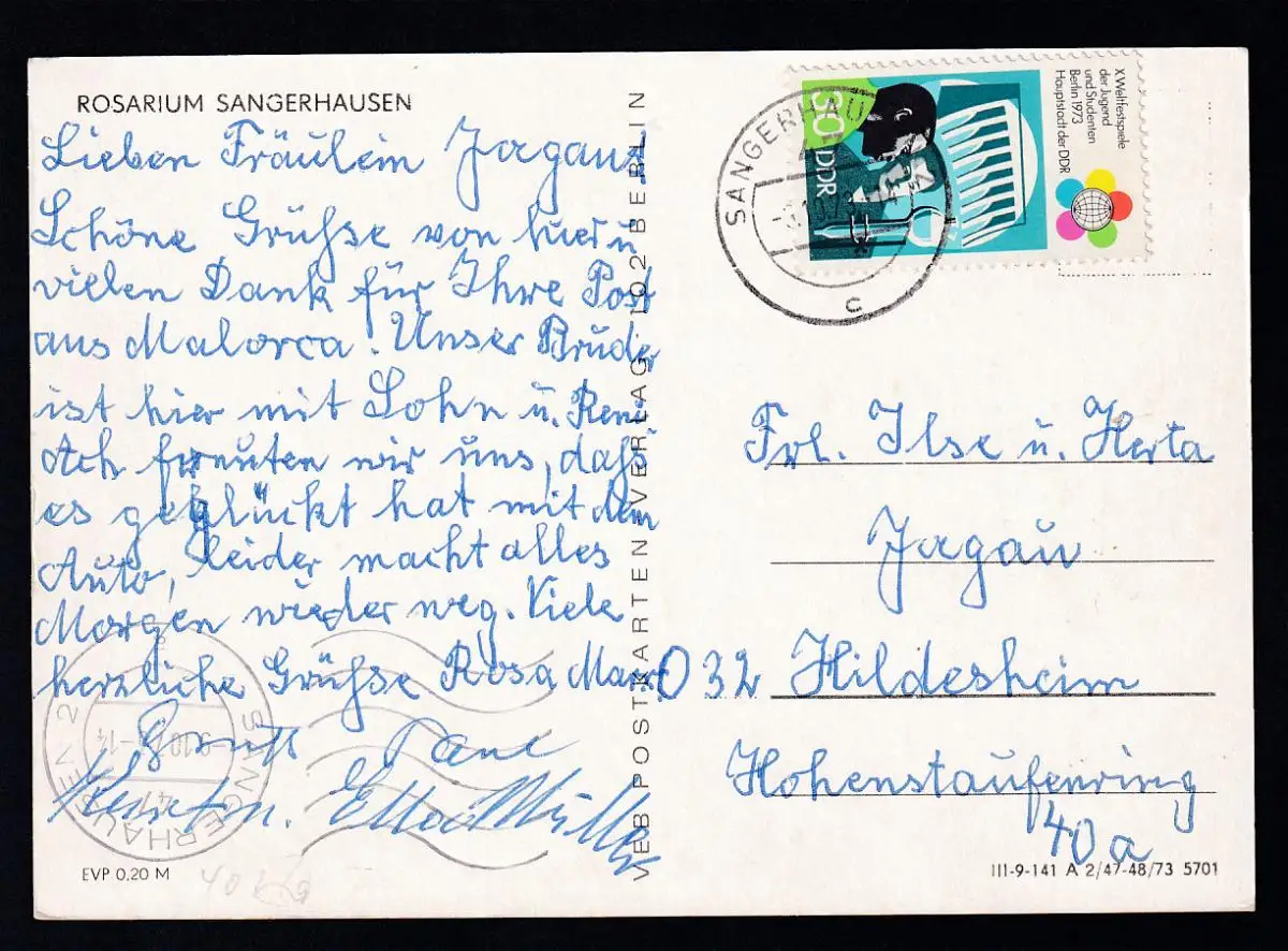 zwei sehr schöne Bahnpostbelege, einmal HUSUM-GARDING von 1916 - ohne Zugnummer aufgrund der Furcht vor feindlicher Spionage - und ERFURT-EISENACH von 1965. Vielen Dank, bin mit der Lieferung sehr zufrieden.