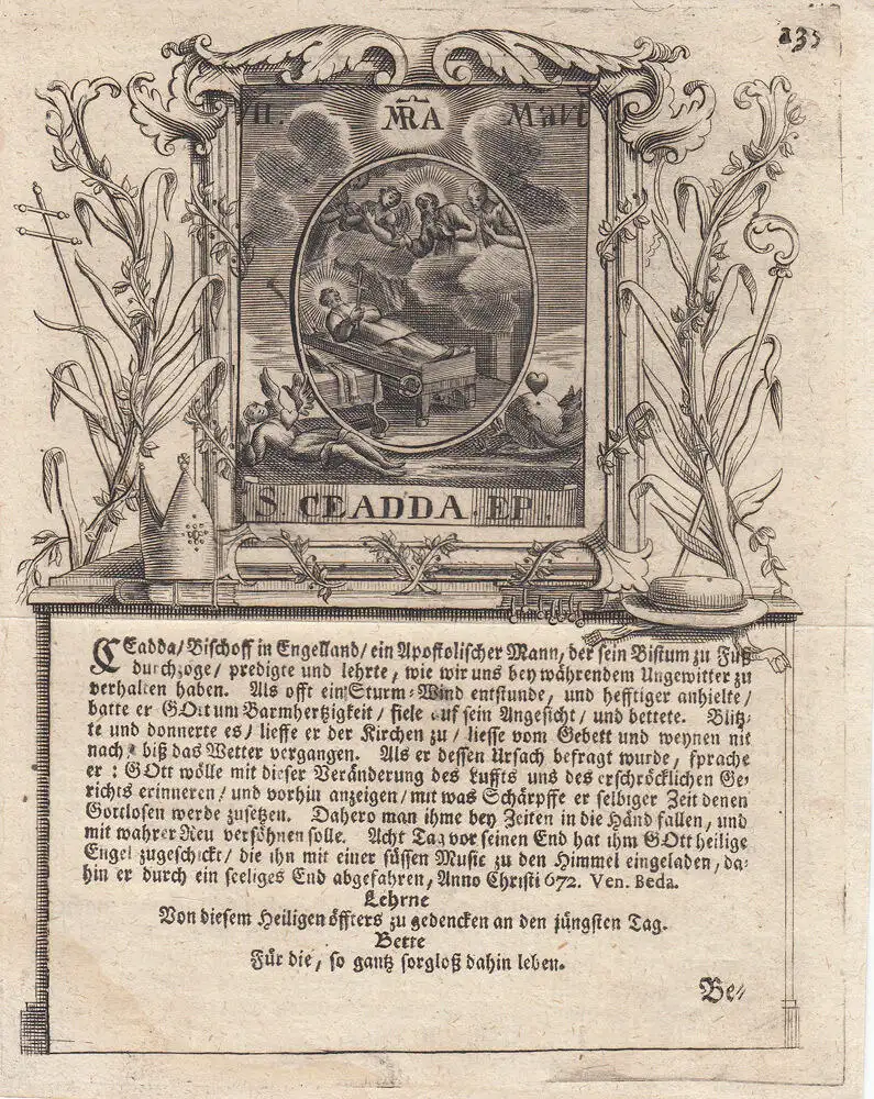 Sankt Ceadda 2. März englischer Bischof Orig Kupferstich um 1750
