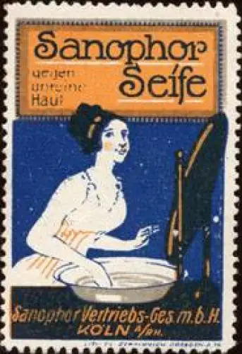 Sanophor - Vertriebs GmbH, Köln, Dame, Kosmetik, Größe/Zustand: 5x4 , guter Zustand, Original alte Reklamemarke die seinerzeit für die Werbung benutzt wurde
