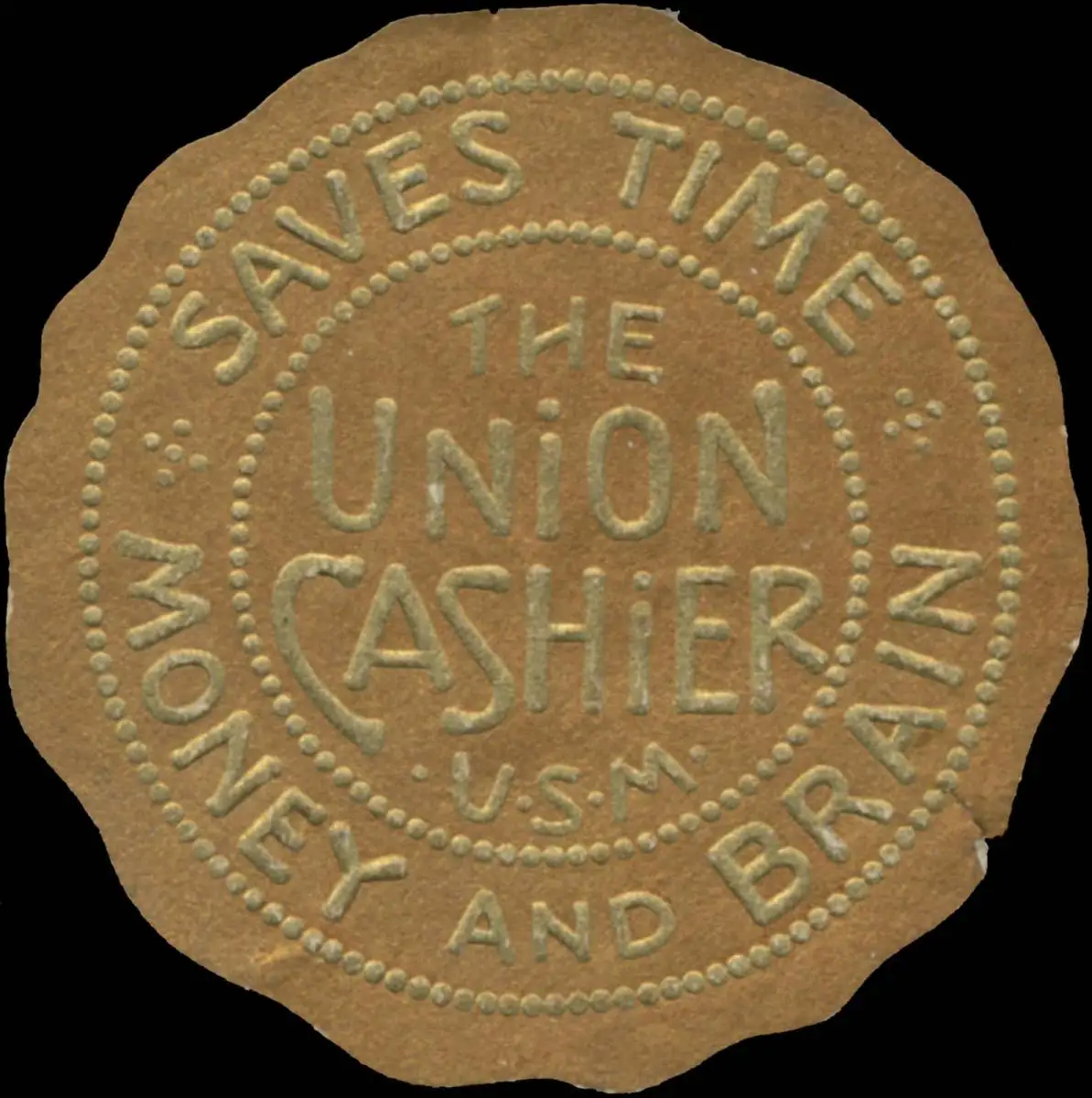 Spart Zeit, Geld und Gehirn, the Union Cashier, Größe/Zustand: 5 , guter Zustand, Original alte Reklamemarke die seinerzeit für die Werbung benutzt wurde