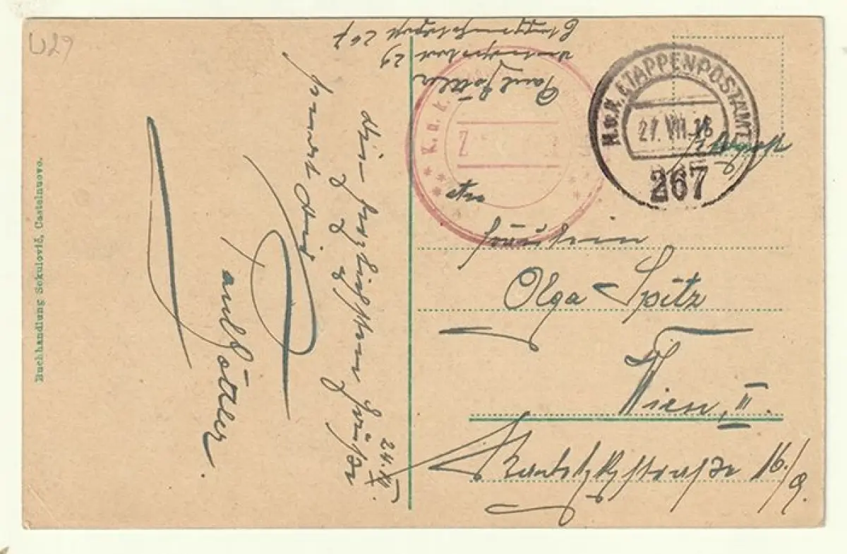 Bemerkungen: Gelaufen m. Stempel: nur handschriftliche Angabe Paul Göttler - Unterseeboot 29 neben K.u.K. EPA/27.VII.18/267 (Albanien XIX. Korpskommando) & K.u.K. Uboot-Stationskommando/Zensuriert/rot.