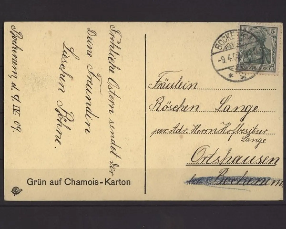 Karte 1909 gelaufen, gute Erhaltung, schwarzer Fleck