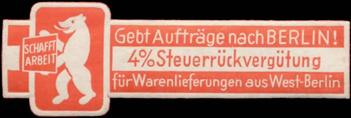 Gebt Aufträge nach Berlin! 4% Steuerrückvergütung für Warelieferungen aus West-Berlin., Größe/Zustand: 2x6 , guter Zustand, Original alte Reklamemarke die seinerzeit für die Werbung benutzt wurde