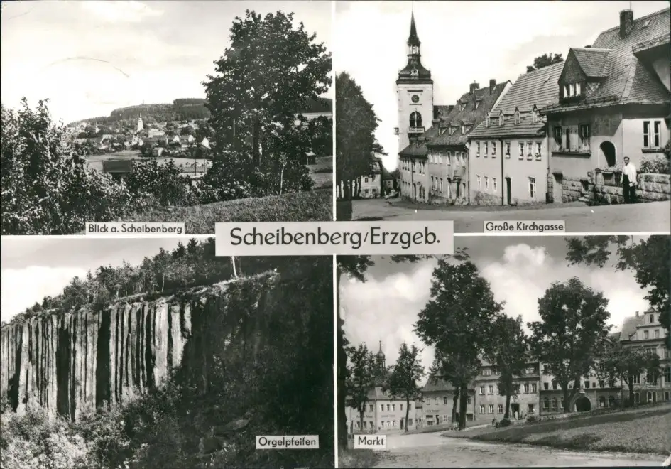 Scheibenberg (Erzgebirge) Totale, Kiechgasse, Markt, Orgelpfeifen 1985