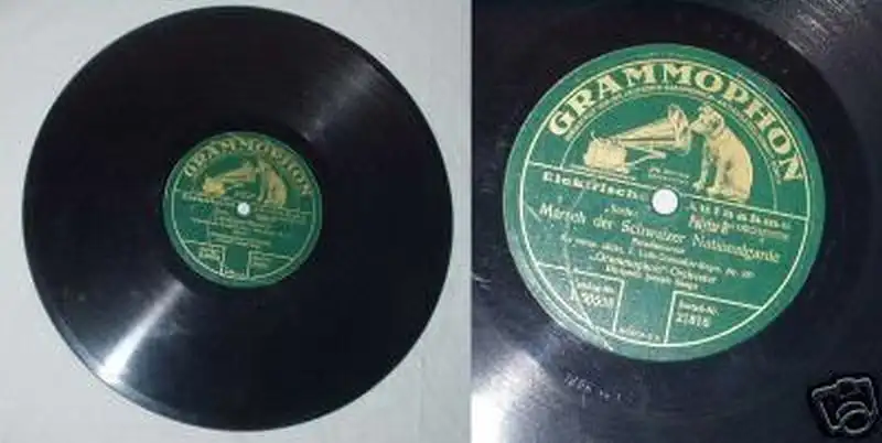 Durchmesser 25 cm "Marsch der Schweizer Nationalgarde" Parademarsch des ehem. sächs. I. Leib-Grenadier-regts. Nr. 100 und "Landjäger-Marsch" Parademarsch des ehem. sächs. Inftr.-Regts. Nr. 104 Grammophon-Orchester normale Altersspuren, siehe Bild