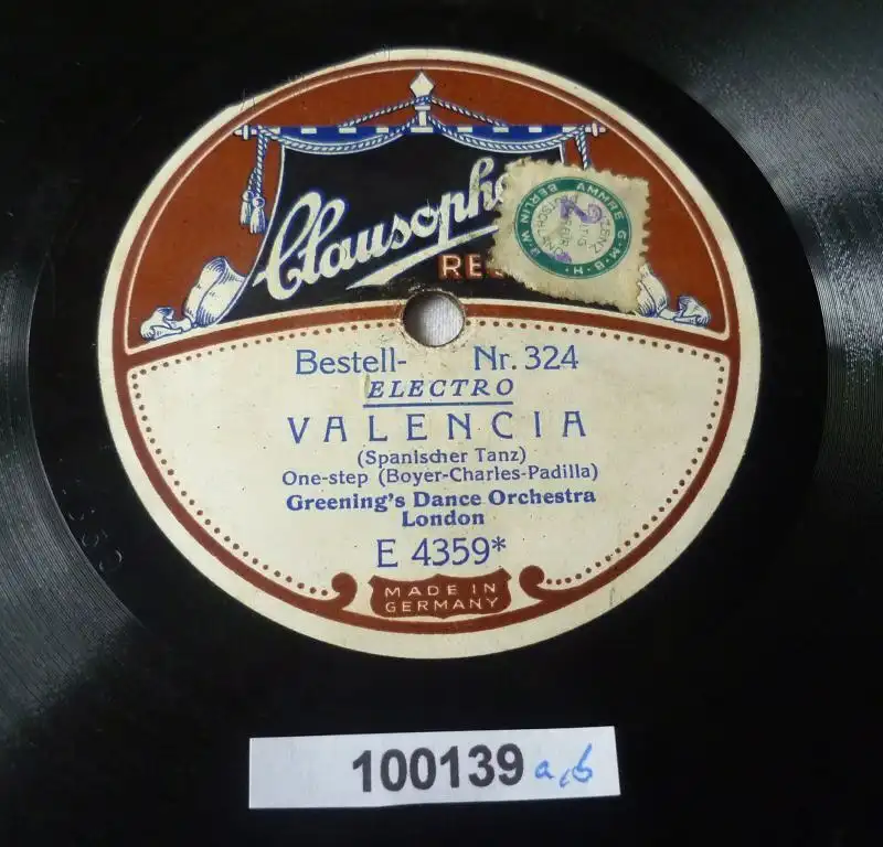 Durchmesser 25 cm Clausophon 324 a und b, "Im Tango-Land" Tango (Newton Cambell & Conolly) Greenings Dance Orchester London und "Valencia" Tango (Boyer Charles Padilla) Greenings Dance Orchester London , gute gebrauchte Erhaltung siehe Bild,