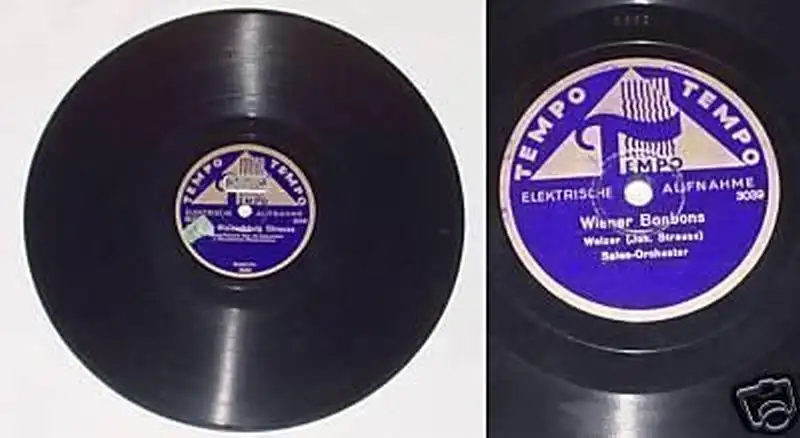 Tempo Nr. 1242 Durchmesser 25 cm "Walzerkönig Strauss" Walzer-Potpourri über die bekanntesten j. Strauss´schen Walzermelodien und "Wiener Bonbons" Walzer (Joh. Strauss) Salon-Orchester gute Erhaltung (geringe Altersspuren), siehe Bild