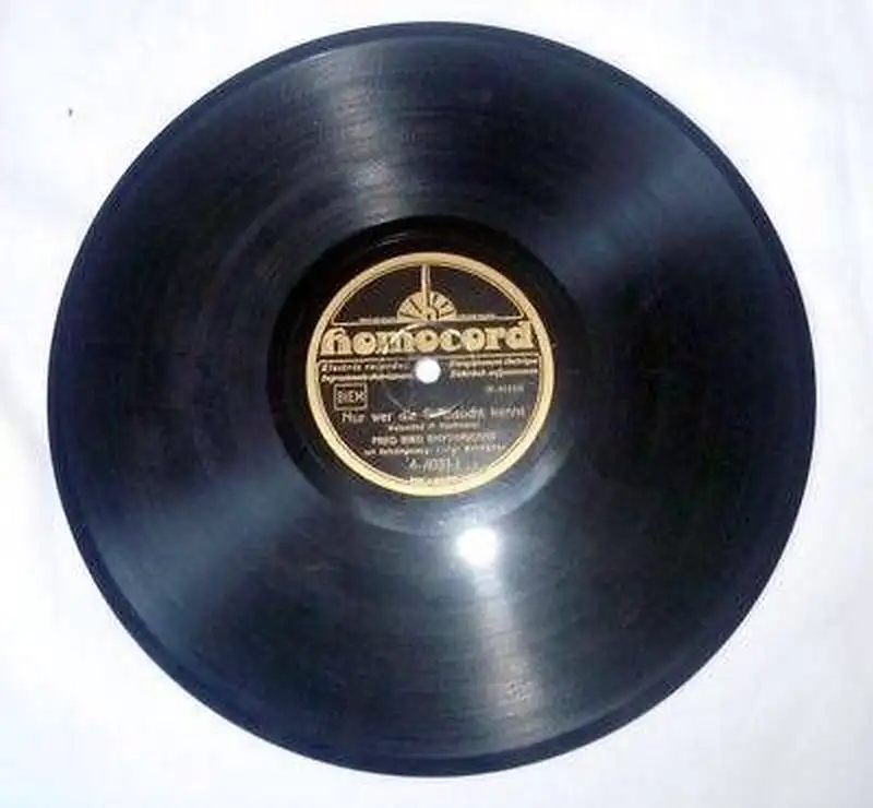 Durchmesser 25 cm Homocord Nr. 4-4031 "Nur wer die Sehnsucht kennt" (Walzerlied) und ""Wenn du mal in Hawai bist" (Tango) Fred Bird Rhythmicans mit Refraingesang Luigi Bernauer guter Zustand, leichte Altersspuren, siehe Bild