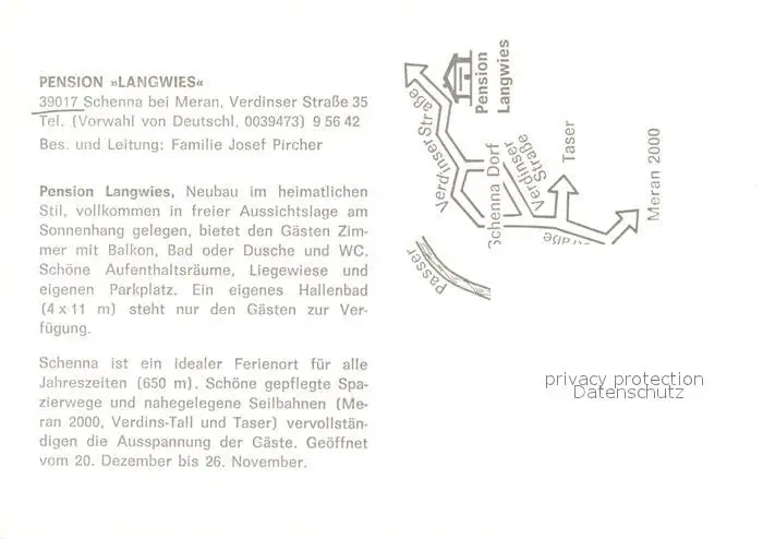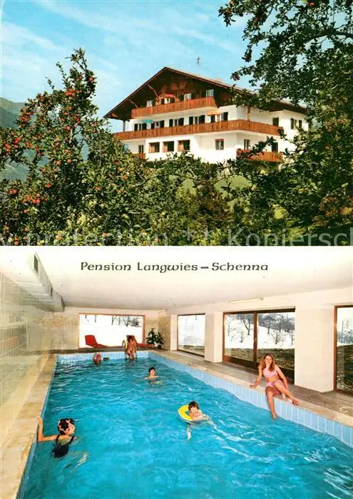 Schenna_Meran Pension Langwies Hallenbad Schenna Meran postalisch nicht gelaufen nach 1965 Werbekarte (keine Postkarte) Erhaltung siehe scans [WerneD78] Werbekarte (keine Postkarte) WernPID7