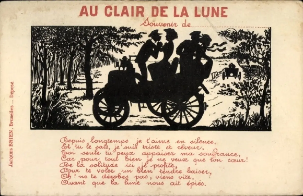 Scherenschnitt Ak Au Clair de la Lune, Liebespaare, Automobil, Gedicht