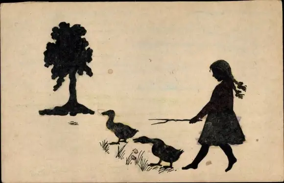 Scherenschnitt Ak Gänsehirtin, Mädchen mit Gänsen