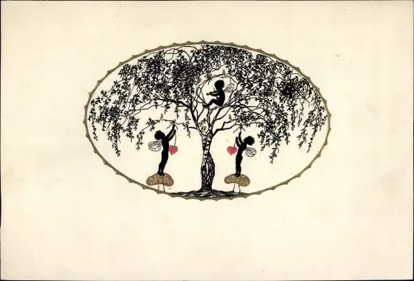 Scherenschnitt Ak Glücksfee am Baum, Pilze, Herzen