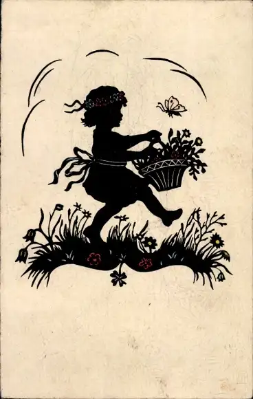 Scherenschnitt Ak Kind mit Blumenkorb, Blumenwiese, Schmetterling