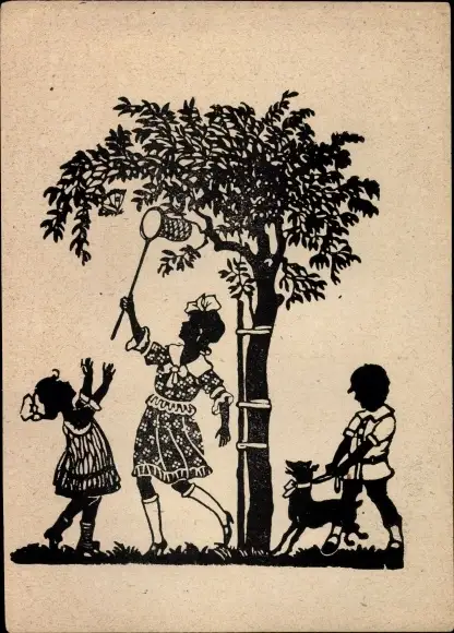 Scherenschnitt Ak Kinder jagen Schmetterlinge, Baum, Hund