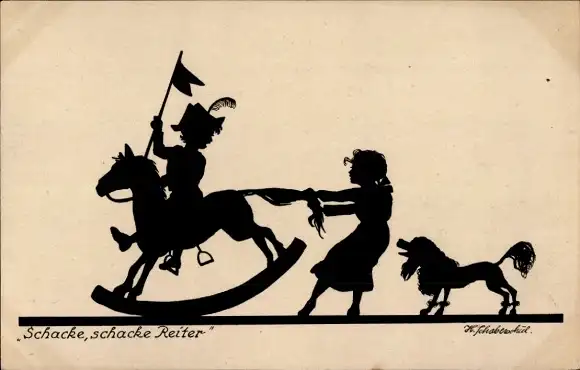 Scherenschnitt Ak Schacke schacke Reiter, Schaukelpferd, Pudel