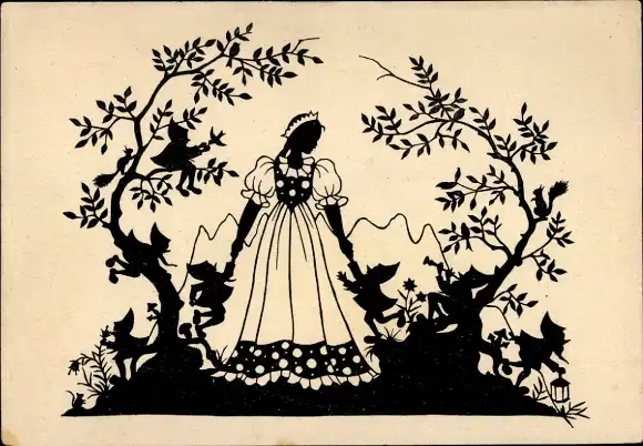 Scherenschnitt Ak Schneewittchen und die sieben Zwerge, Märchen