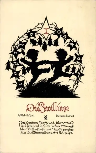 Scherenschnitt Ak Sternzeichen Zwillinge, Im Denken stark und klar, in Liebe und in Güte wahr