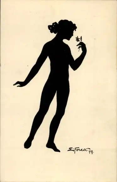 Scherenschnitt Künstler Ak Forck, E., Junge Frau riecht Blume