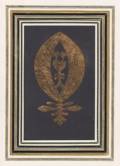 Bemerkungen: Mittig in einem mandelförmigen Ausschnitt sind zwei Vögel über einem Herz zu sehen. Es handelt sich wohl um eine Replika eines Schernenschnittes, der sich in einem Gebetsbuch von Franz Schuberts Schwester Therese befindet. Laut Aufdruck auf dem Passepartout befindet sich das Original im Wiener Stadtarchiv.